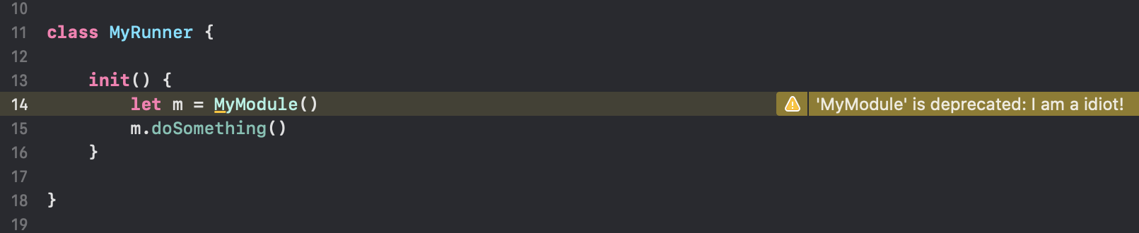 제일 첫 필드에 *를 넣었는데, 여기에 특정 플랫폼을 부여할 수 있습니다. 예를 들어 아래 코드는 iOS용으로 빌드할 때만 deprecated 되었다는 경고를 표시합니다.