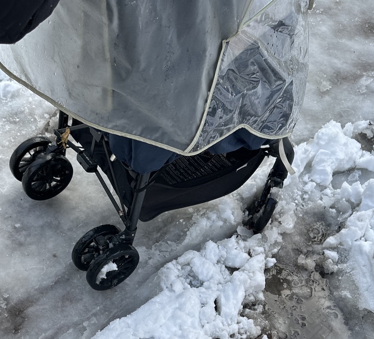 얼어붙은 곳은 얼어붙은 대로 당연히 미끄럽다. 안 얼고 쌓인 부분은 그대로 바퀴가 걸리거나 빠져버리고 웬만한 힘으로도 밀리지 않았기에 온몸을 써서 밀거나 뒤로 빠져나온 뒤 다시 방향을 잡아야 했다. 바닥이 얼었든 안 얼었든 유모차를 앞으로 똑바로 밀어도 옆으로 드리프트를 하는 역동적인 경험을 할 수 있었으며 온몸으로 방향을 지탱해야 했다.