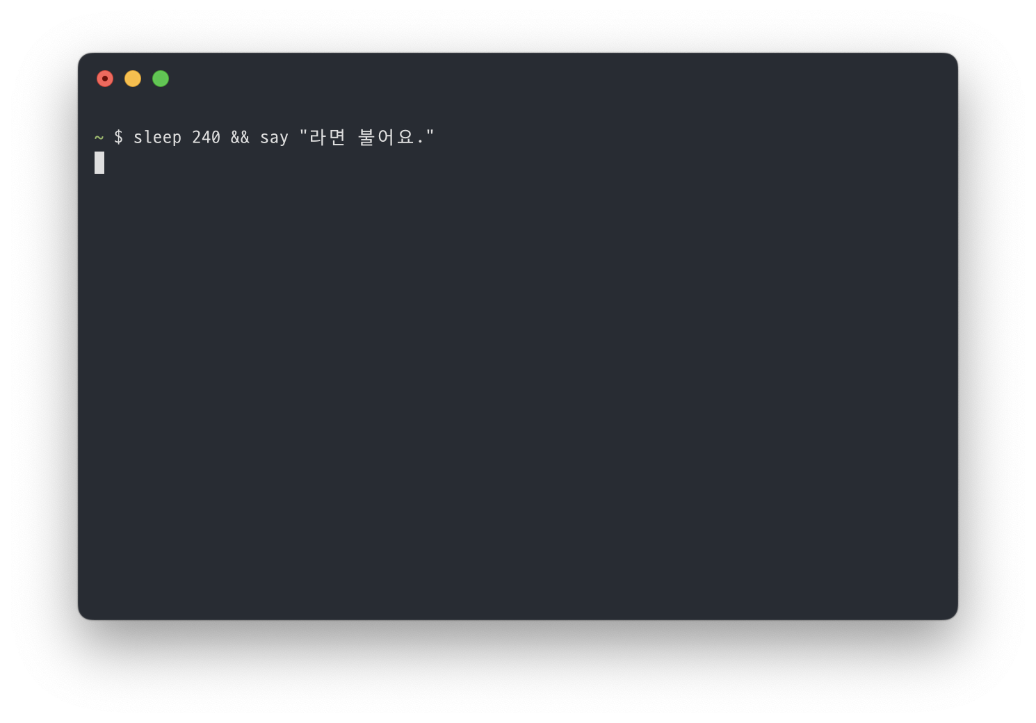 $ sleep 240 && say "지금 주인님의 젓가락을 기다리는 컵라면이 애타게 불고 있어요."