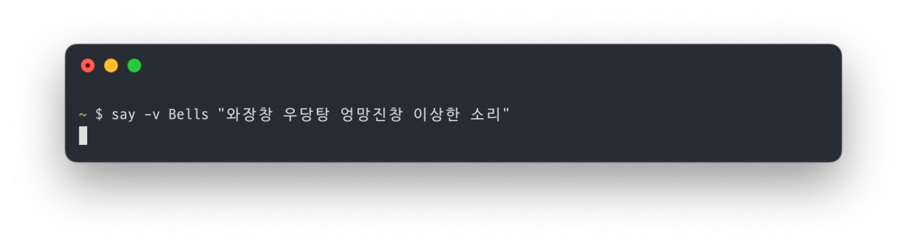 이전에 터미널에서 타이머를 흉내내기 글에서 소개했던 say 커맨드를 활용한 macOS 내장 TTS를 활용하는 방법으로 -v 옵션으로 목소리를 고를 수 있다. 위는 Bells라는 이름이긴 하지만 구식 로봇 목소리 연출 같은 기계음에 가까운 소리가 난다. 참고로 Bells 음성으로 한글을 플레이시키면 이상한 소리가 나니 조심(?)하자.