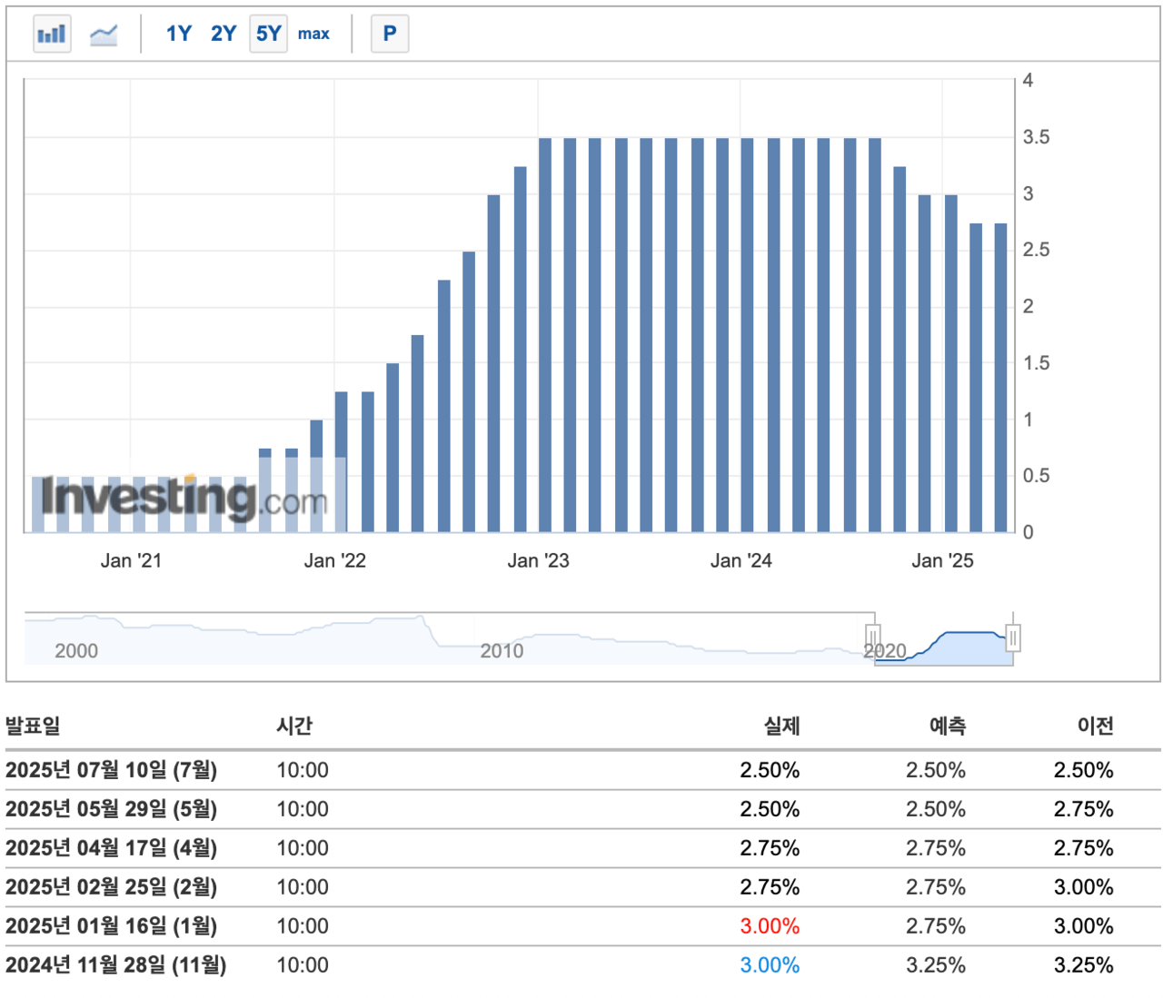 7월 10일 오전에 열린 한국은행 금융통화위원회 회의에서는 기준금리를 2.50%로 동결 결정했다.