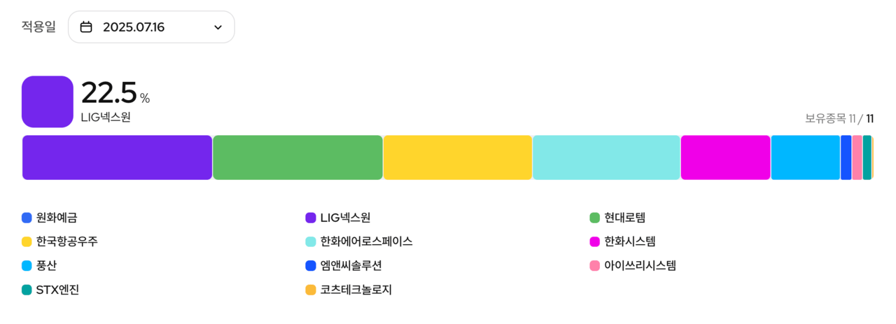 - LIG넥스원: 온갖 유도무기나 드론 등 다양한 무기를 제작하는 기업으로 가장 순수한 방산 업체라고 느껴진다. TOP4에 선정되기에 분명한 기업이긴 하지만 조사 시점에서 비중이 가장 높은 건 좀 이해가 가지 않는 상황이긴 하다.